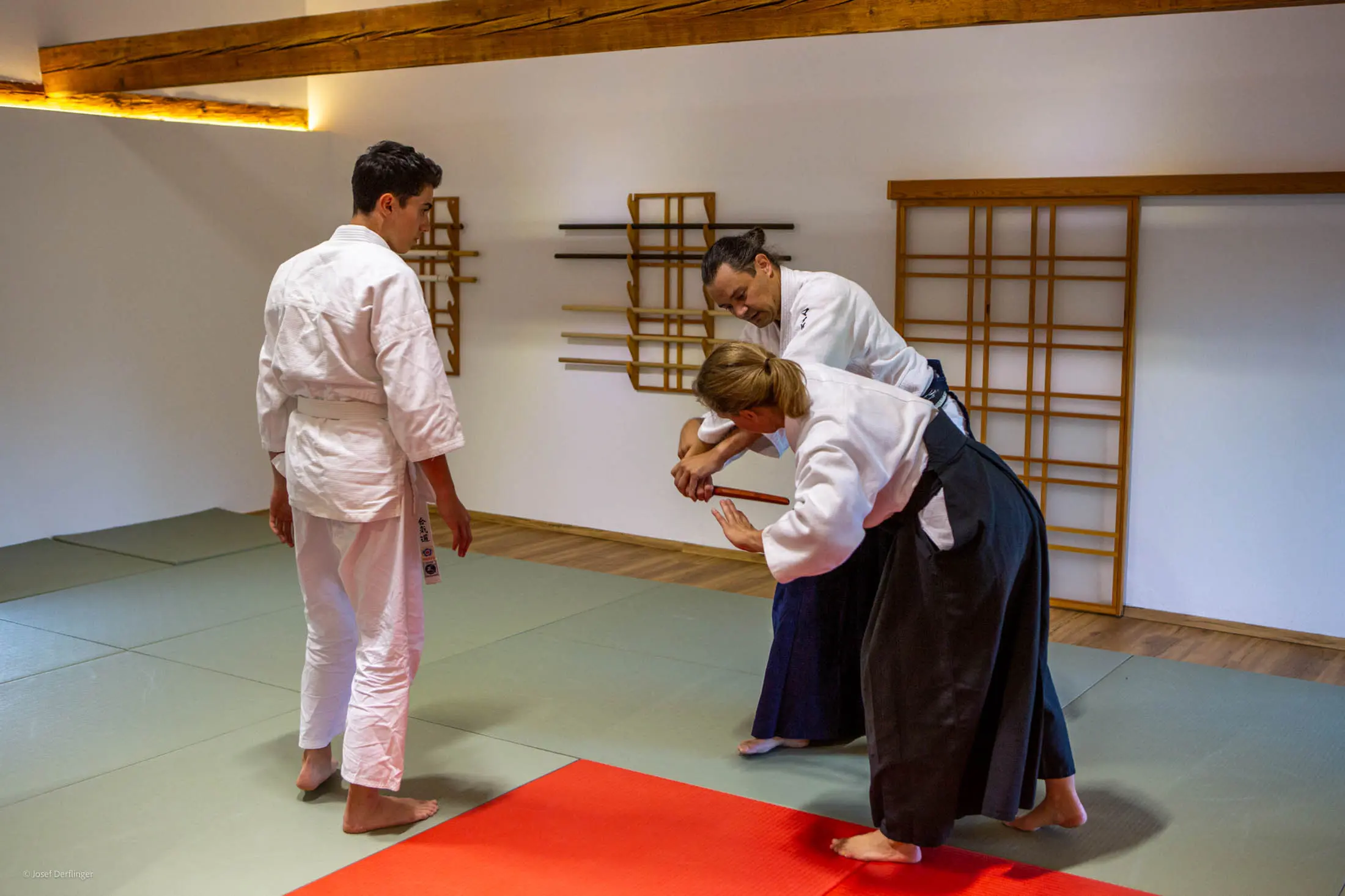 – Wechselnde Rollen: Einer greift an (Uke), der andere führt die Technik aus (Tori).